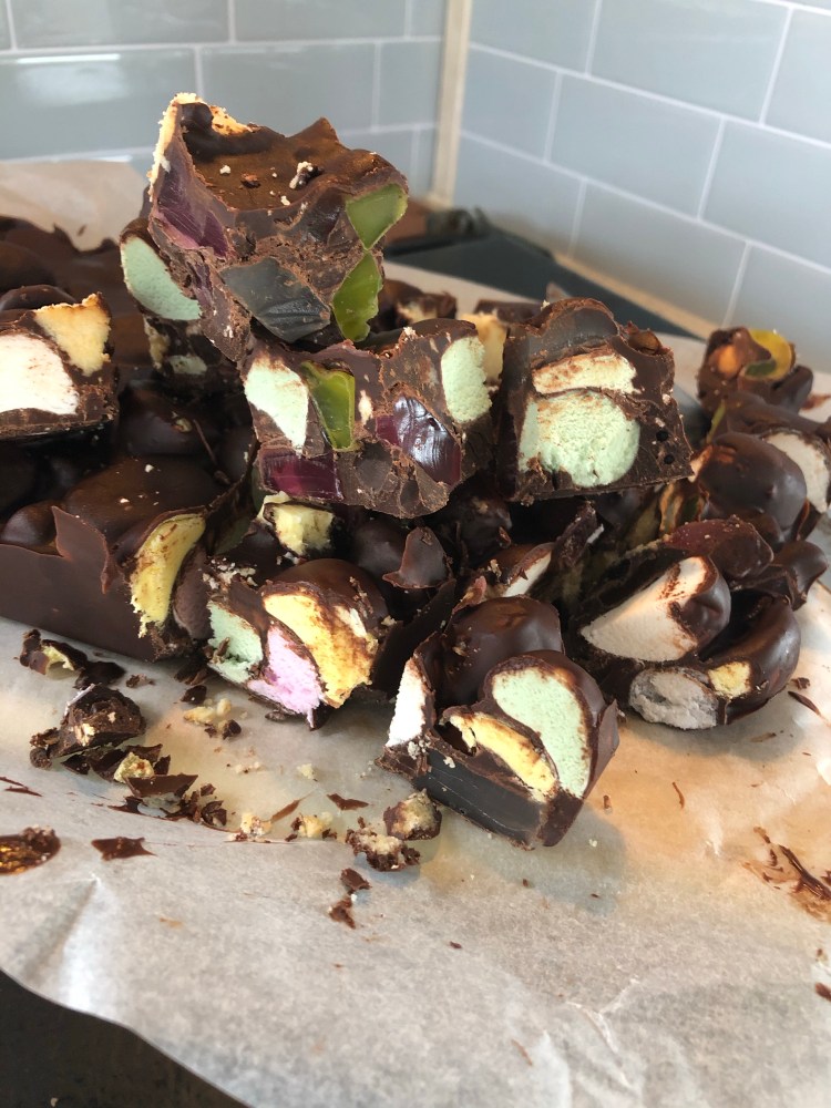 another thing Dustin loves that I added to the table was rocky road. this recipe is so super versatile you can really make it however you want, add whatever you want, more or less of whatever you want, there are no rules here, im not even worried if you prefer your chocolate to rocky ratio to be higher or lower. but ill give you my latest, and i say latest because it will probably change again next time i make it.