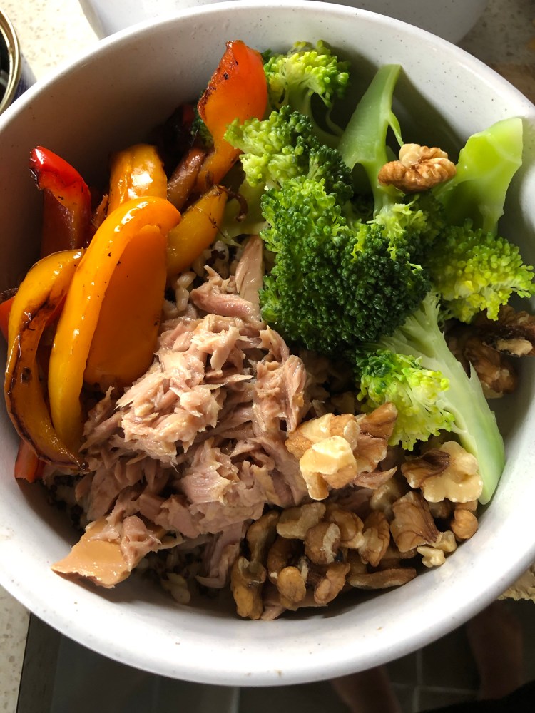 once you have cooked everything put some rice in the bowls, top with your tuna, cooked veggies and nuts. then serve